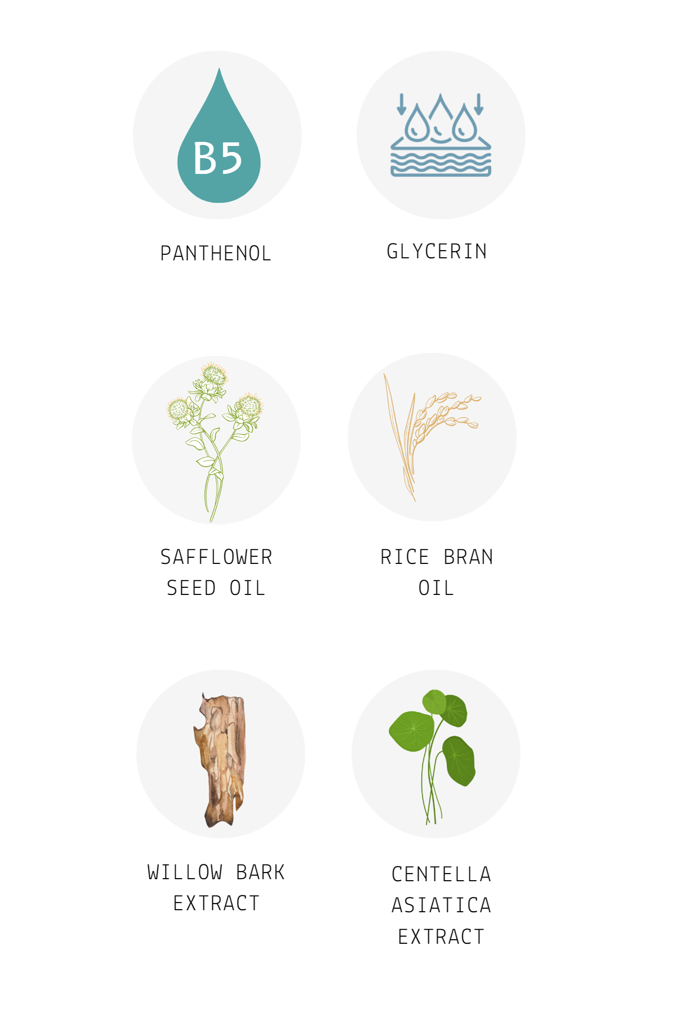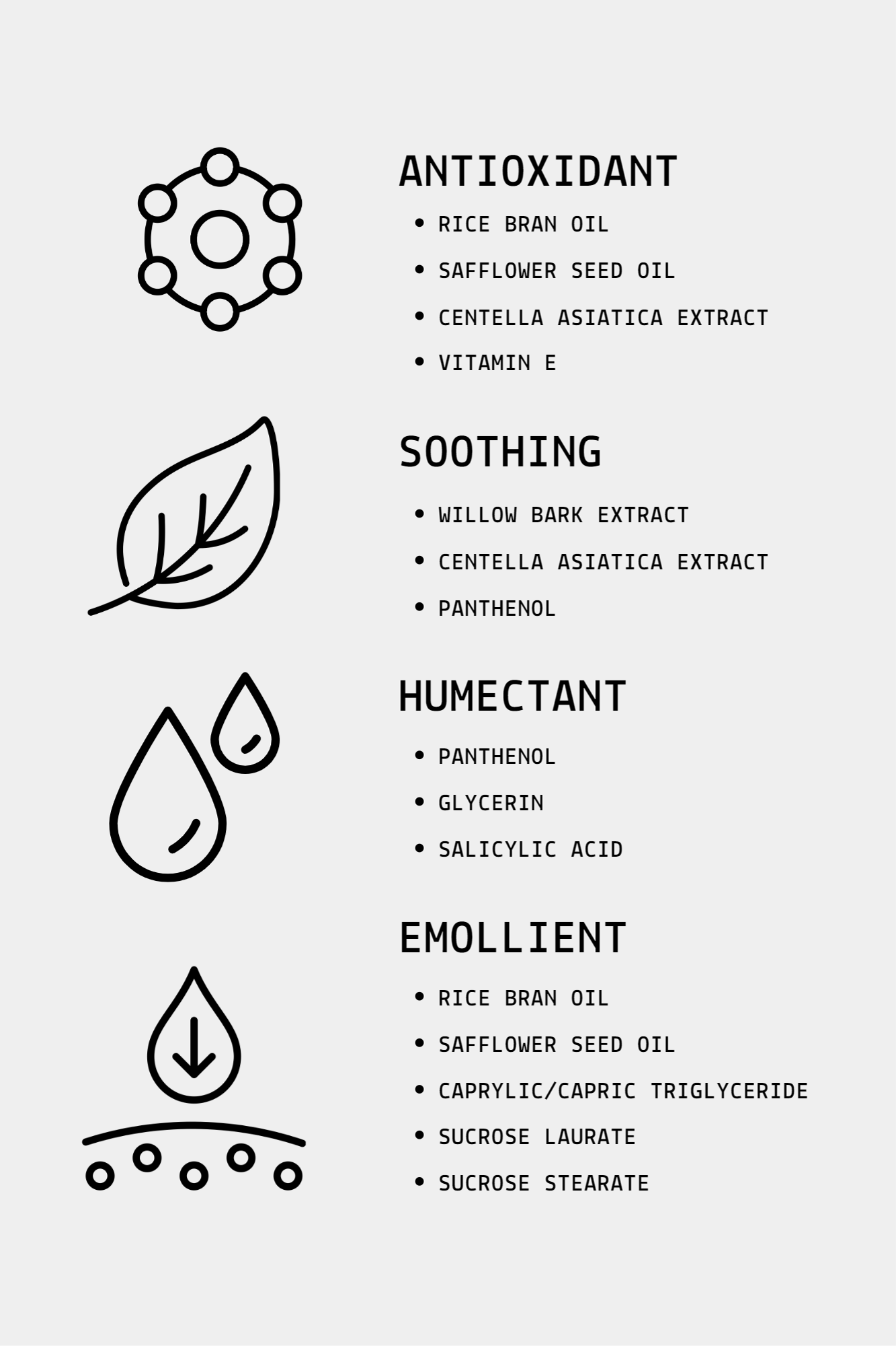 Oryza Sativa Bran Oil, Carthamus Tinctorius Seed Oil, Glycerin, Caprylic/Capric Triglycerides, Aqua, Sucrose Laurate, Sucrose Stearate, Salix Alba Bark Extract, Centella Asiatica Extract, Panthenol, Tocopherol Acetate, Phenoxyethanol, Ethylhexylglycerin