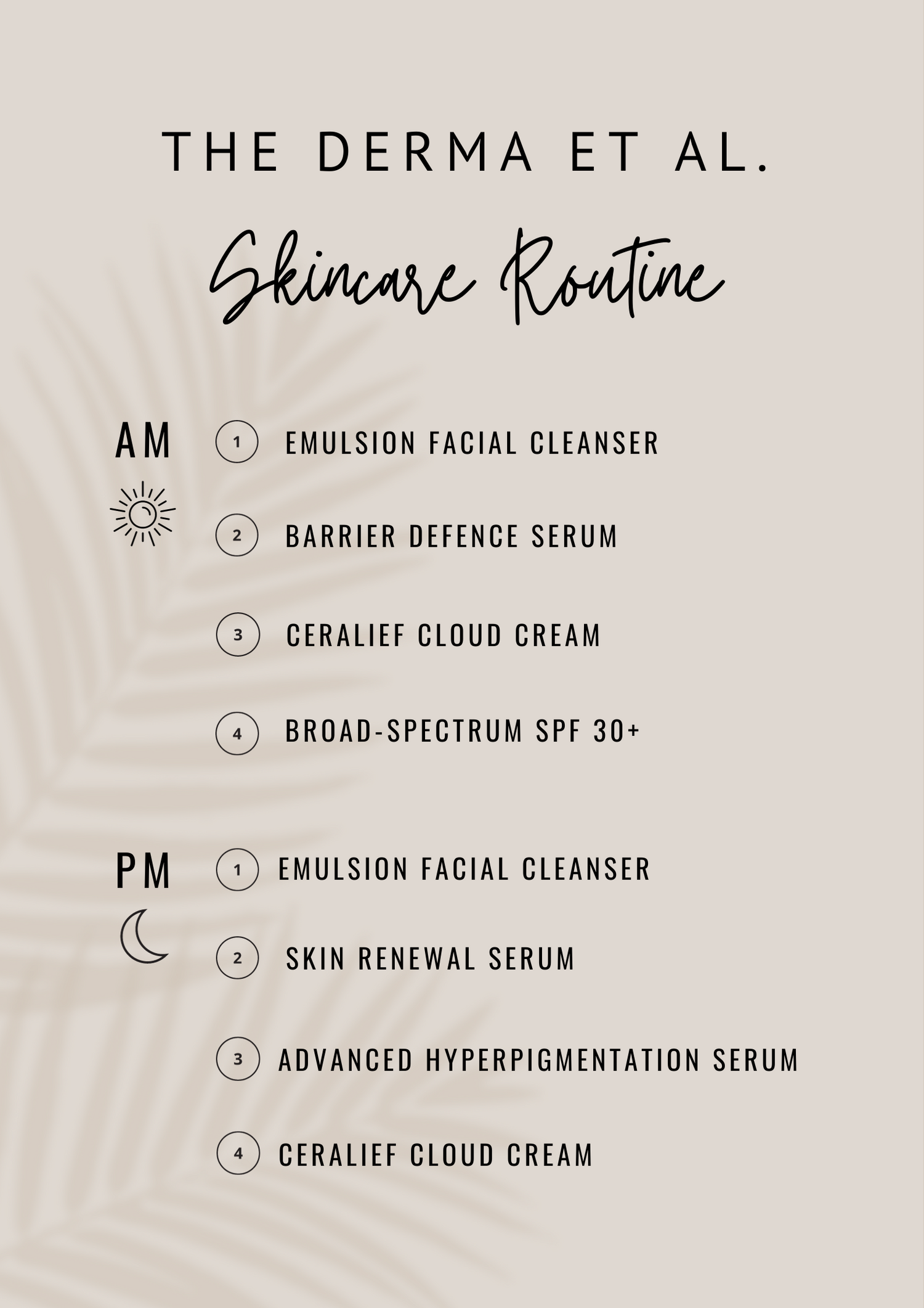 Using the full DERMA et al. line in your skincare routine has many benefits. Our products are formulated to work together synergistically and build upon the effects of one another. The Emulsion Facial Cleanser is an oil-in-gel texture that soothes the skin. It provides anti-inflammatory benefits and leaves the skin clean, soft, and nourished. The Barrier Defence Serum will work to strengthen, protect, and maintain a healthy skin barrier. It also works to stimulate collagen and elastin synthesis. The Advanced Hyperpigmentation Treatment is formulated to correct and prevent hormonal (melasma), post-inflammatory, and sun-induced hyperpigmentation. It also provides antioxidant protection and shields the skin from environmental aggressors. The Skin Renewal Serum is a lightweight corrective serum that combats signs of ageing with a blend of powerful ingredients. It features encapsulated retinol and hydroxypinacolone retinoate to accelerate skin cell turnover and reduce the appearance of fine lines, wrinkles, and uneven skin tone while minimizing any potential sensitivity.